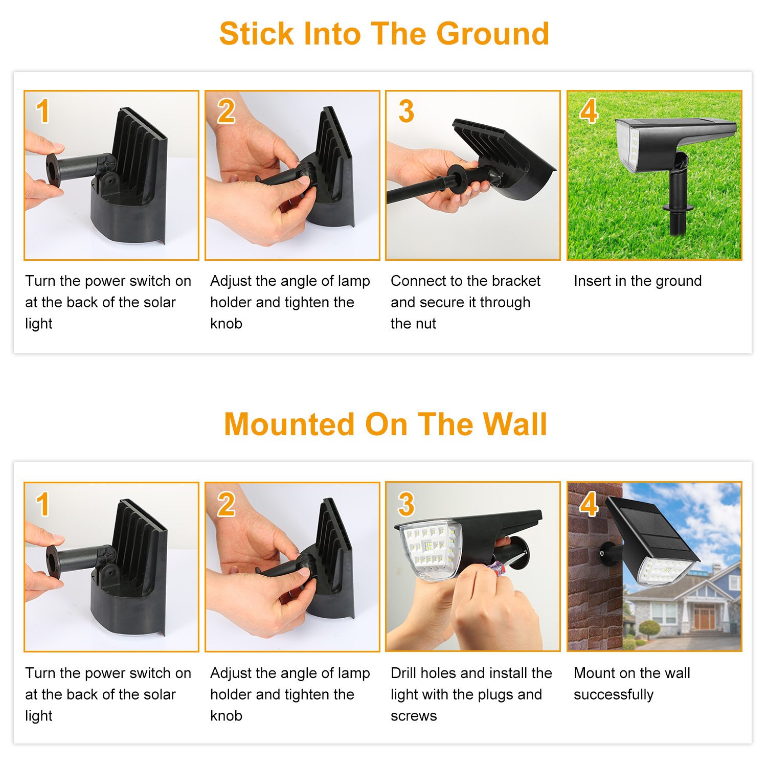 **2 Installation Options*:Stick into the ground with stakes/Mount on the wall with the screws included. 90° adjustable solar panel offers perfect lighting angle. Optimum for Patio,Porch,Path,Deck,Pool,Yard,Garden,Garage,Driveway,etc.